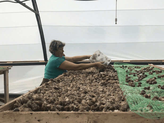 Производственные мощности фермы составляют около 100 тонн. Выбранную икру улиток размещают на полках в специальных корексах, где при определенной температуре и влажности она остается до момента развития. Улиткам нужно тепло. В теплой температуре они быстро вылупляются и растут. Малек находится в теплице до двух месяцев, где условия его содержания максимально оптимизированы. Режим влажности строго контролируется для обеспечения лучшего развития. Во всех зонах теплицы установлены распылители воды, которые равномерно увлажняют воздух и субстрат. Благодаря этой системе поддерживается необходимый микроклимат, способствующий здоровому росту малька. затем молодую улитку выпускают в поле. Здесь три-четыре месяца он произрастает до товарной формы. Улиток, как оказалось, нужно пасти, иначе они разбегаются. Электрический пастух окружает улиточное поле, но некоторым из них удается скрыться.