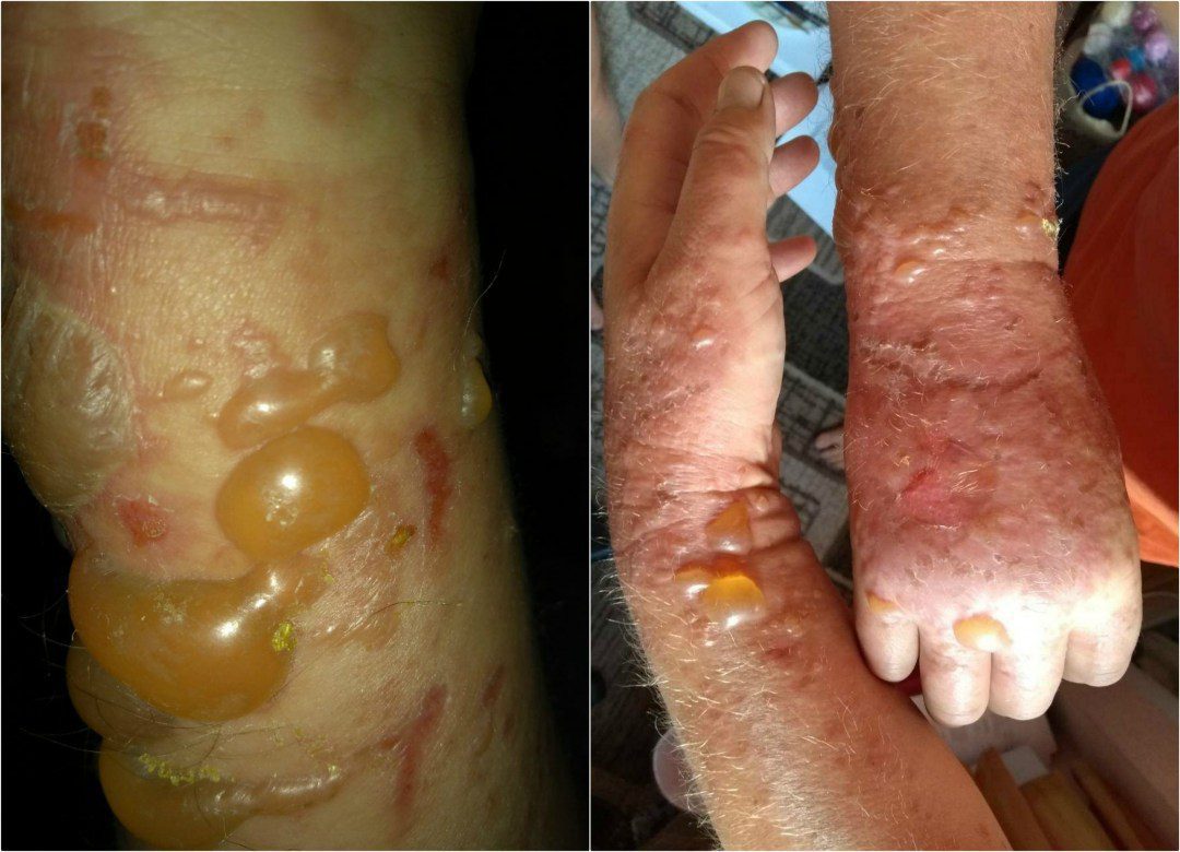 Спочатку людина нічого не відчуває, але вже за кілька годин розпочинається легкий свербіж, почервоніння, а потім з’являться пухирі. Якщо ж опіки будуть дуже сильні, то можливе підвищення температури, може початись лихоманка та з’являться виразки. Такі пошкодження дуже довго заживають й залишають після одужання рубці.